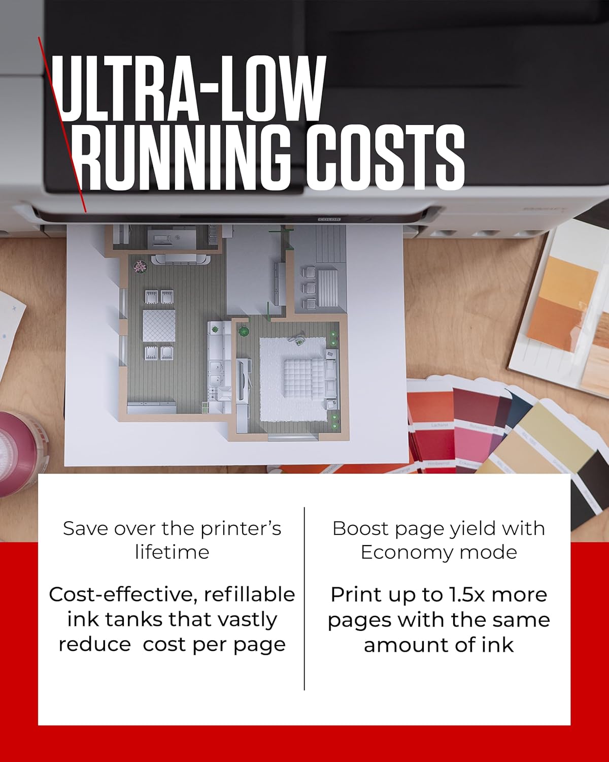 • COST-EFFICIENT – Save over the printer’s lifetime thanks to cost effective refillable ink tanks that vastly reduce the total cost of ownership and cost per page. Boost page yield with Economy mode and print up to 1.5x more pages with the same amount of ink.