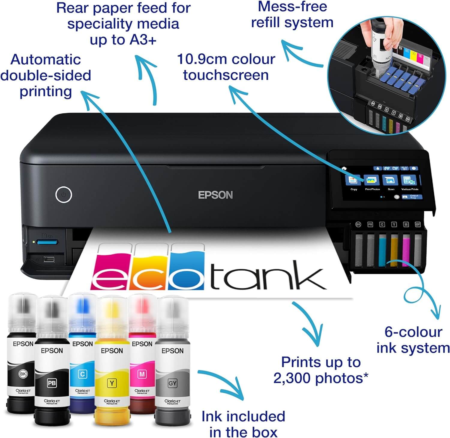 • 6-COLOUR INK SYSTEM – The Epson Claria ET Premium inks produce high-quality, long-lasting photos up to A3+ size as well as outstanding black and white photos with the new grey ink, The pigment black ink is ideal for printing sharp text on plain papers.